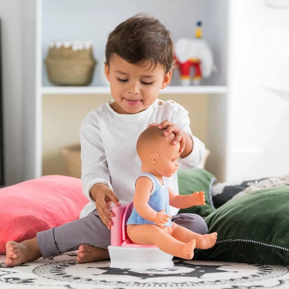 Son grand poupon est bientôt propre et va arrêter de porter des couches : il faut alors lui apprendre à utiliser les toilettes ! Les toilettes interactives sont parfaites pour initier cet apprentissage. Avec son couvercle qui s’ouvre comme de vraies toilettes, on peut asseoir son poupon pour faire semblant. Le bouton de la chasse d’eau permet d’activer 2 sons : celui du pipi et celui de la chasse d’eau. Les toilettes interactives fonctionnent avec des piles.