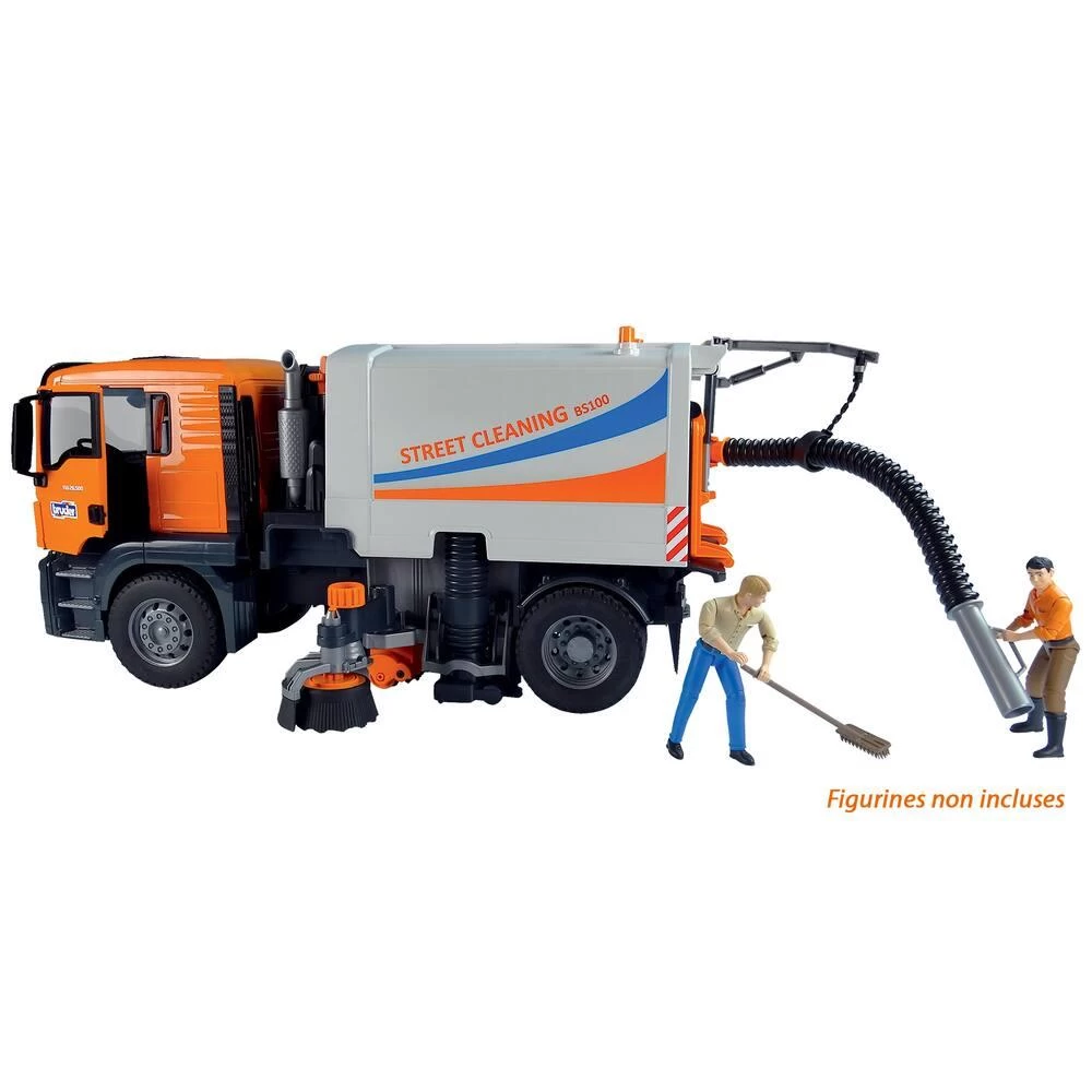 Echelle 1/16ème. Camion Man TGS pour le nettoyage des rues. Les portes de la cabine s’ouvrent. La benne est basculante. Avec un tuyau flexible et une brosse de nettoyage de chaque côté du camion. Les brosses de chaque du camion sont dépliables manuellement. En plastique. Pour jouer à l’intérieur et à l’extérieur. Le véhicule de nettoyage des rues Bruder MAN TGS est le partenaire idéal. Le corps de balayeuse de rue comporte deux brosses rotatives et réglables qui peuvent également être ajustées en hauteur. Une longue brosse a été installée sous le véhicule pour nettoyer les surfaces. L’arrière dispose du tuyau flexible, y compris le tuyau d’aspiration pour nettoyer de plus grandes quantités de saleté. Le conteneur à déchets peut être incliné et la porte arrière s’ouvre pour le vider.