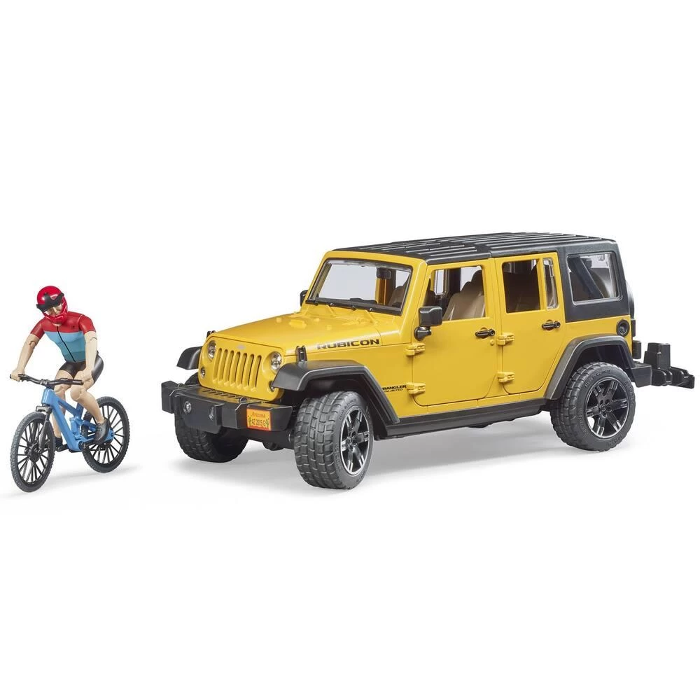 Echelle 1/16 Ăšme. Jeep Wrangler Unlimited Rubicon avec un vĂ©lo de montagne et un cycliste. Roues avant directionnelles avec petit volant additionnel. Le capot et les portes s’ouvrent. La banquette (siĂšges) Ă l’arriĂšre est amovible. Alternativement, le siĂšge arriĂšre peut ĂȘtre enlevĂ© pour crĂ©er de l’espace pour les accessoires compatibles Bruder dans l’espace de chargement. Les essieux sont dotĂ©s de pneus de suspension et de bande de roulement typiques de vĂ©hicules tout-terrain avec des roues chromĂ©es. Le vĂ©lo de montagne peut ĂȘtre montĂ© sur le support Ă vĂ©los fermĂ© qui est attachĂ©.Avec 1 cycliste : figurine articulĂ©e de 10.5 cm avec son casque. En plastique. Pour jouer Ă l’intĂ©rieur et Ă l’extĂ©rieur. Dimensions de la jeep : 37 x 15 x 14 cm, du vĂ©lo environ 11 x 3,7 x 7 cm.