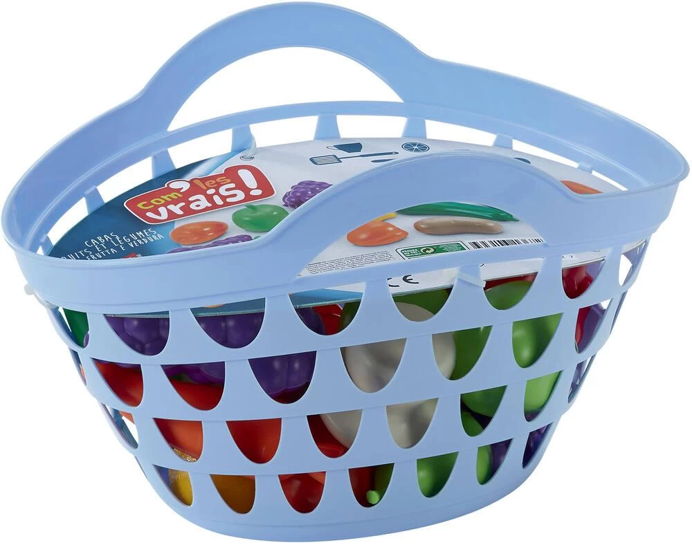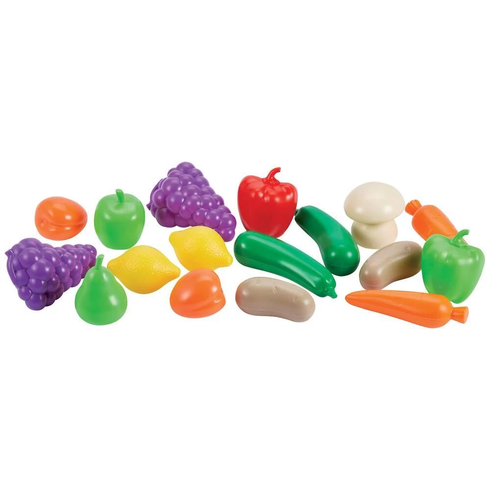Un joli cabas rempli de fruits et légumes. Détail des 17 fruits et légumes inclus : 1 champignon, 2 citrons, 2 courgettes, 2 carottes, 2 oranges, 2 pommes de terre, 2 poivrons, 1 pomme, 1 poire et 2 grappes de raisin. En plastique.