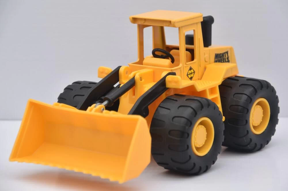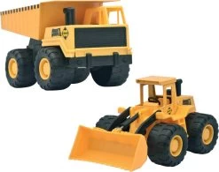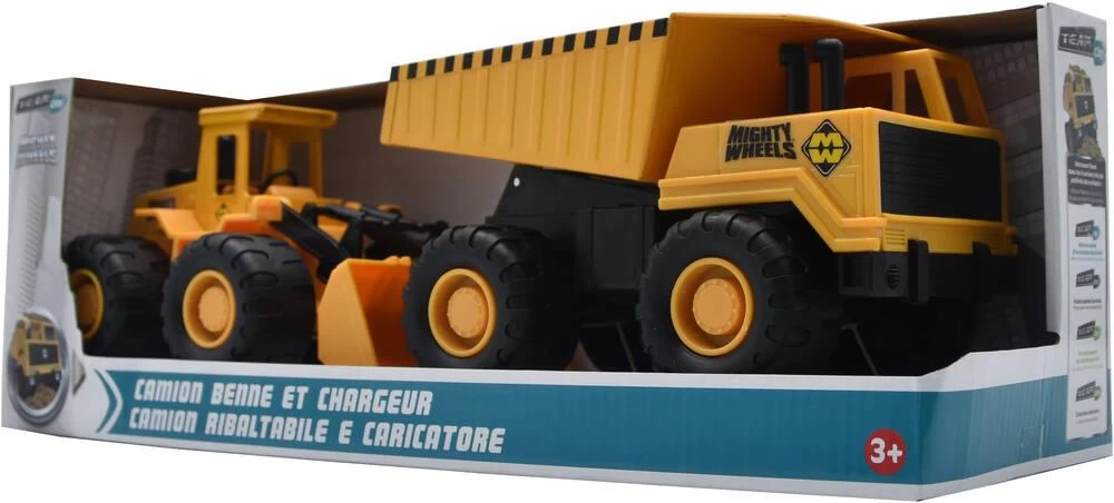 Contient un camion benne et un chargeur sur roues Mighty Wheels®. En métal (acier) et plastique. Véhicules roues libres. Camion avec benne basculante. Dimensions : du camion benne 18 x 10 x 11 cm, du chargeur 18 x 10 x 11 cm.
