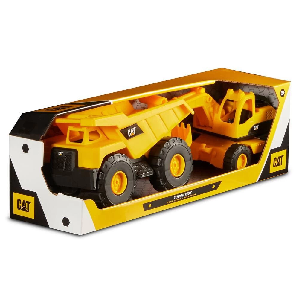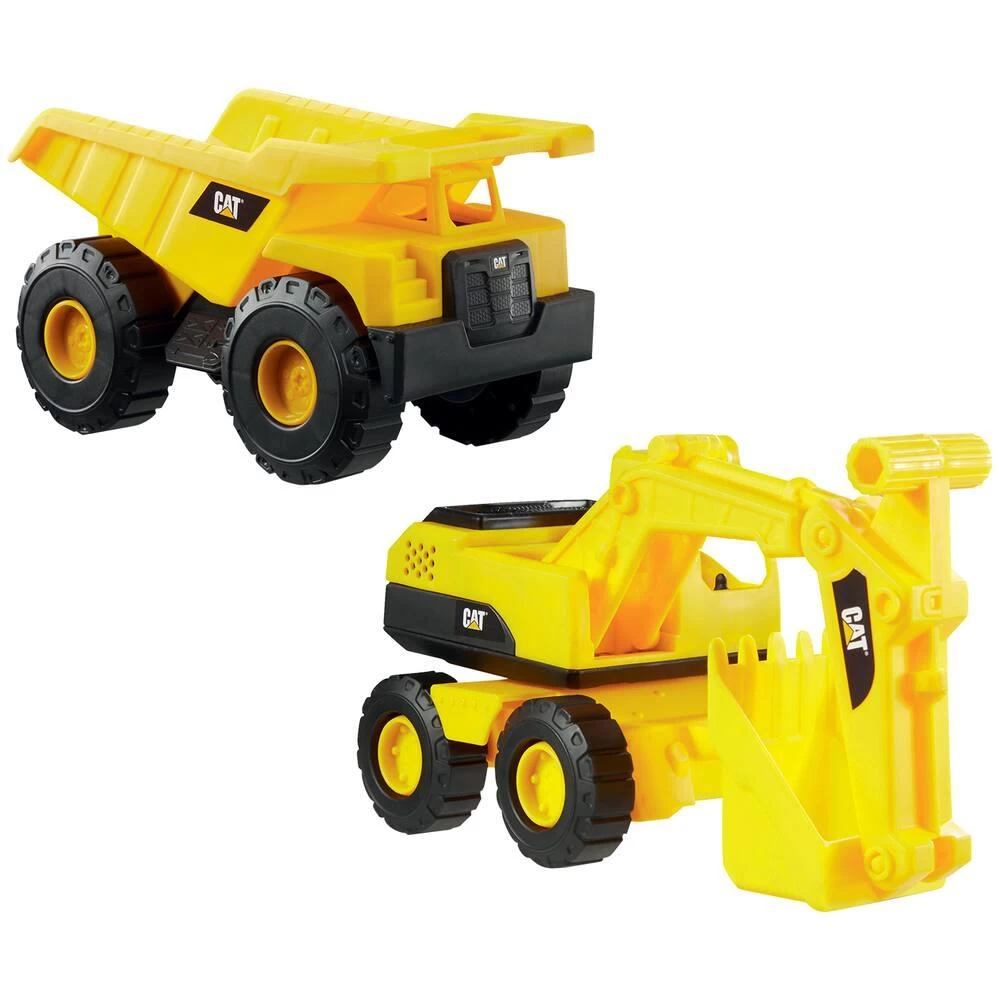 Comprend deux véhicules de 38 cm à roues libres. Un camion à benne basculante et une excavatrice.