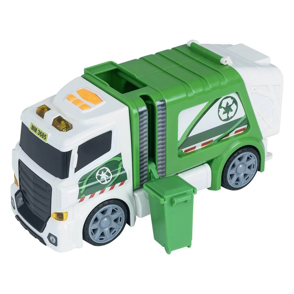 Camion de recyclage roues libres. Appuie sur un bouton pour faire avancer ou reculer le camion. Avec effets sonores et lumineux : 5 sons diffĂ©rentes et des lumières. La porte arrière de la benne s’ouvre manuellement. Avec 1 poubelle incluse. Simple d’utilisation. En plastique.