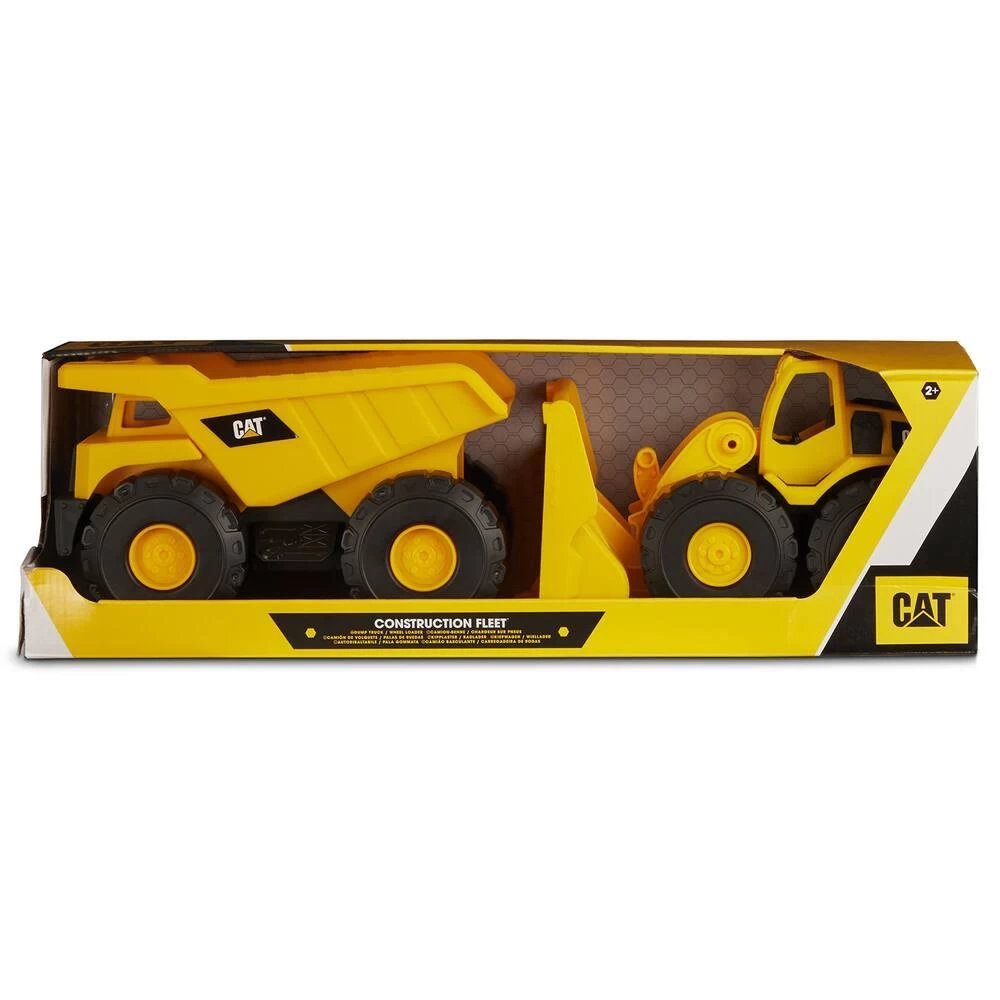 Pack de 2 véhicules plastiques roues libres articulés 25 cm. Comprend 1 camion à benne basculante et un chargeur frontal.