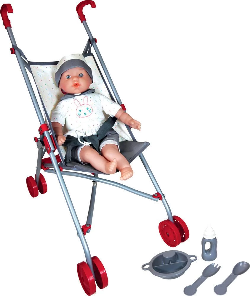 Coffret promenade bébé. Contient : 1 poupon au corps souple (40 cm), 1 poussette canne, 1 biberon, 1 assiette ovale, 1 cuillère et 1 fourchette.