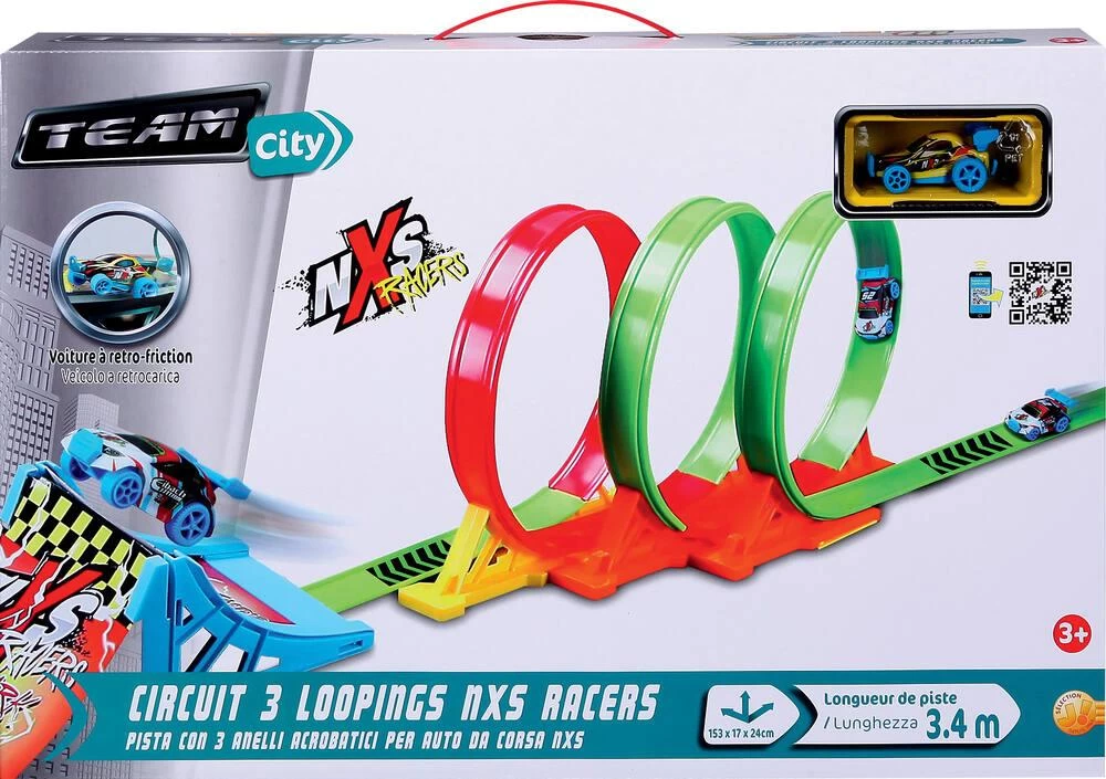 NXS Racers. Circuit avec 3 loopings et 1 rampe de saut. 1 voiture Ă rĂ©tro-friction incluse. Longueur de piste 3.4 mètres. Active la voiture Ă rĂ©tro-friction et lâche-la pour la voir s’Ă©lancer dans le circuit ! Notice de montage, des autocollants et 1 tablier de rĂ©ception en carton inclus pour la rampe de saut. DĂ©couvre les NXS Racers : flashcode imprimĂ© sur la boĂ®te. Compatibles avec les produits NXS Racers, rĂ©fĂ©rences 18-30409 et 18-30410 vendues sĂ©parĂ©ment. En plastique. Dimensions : circuit assemblĂ© 153 x 17 x 24 cm, voiture 6 x 3 x 3 cm.