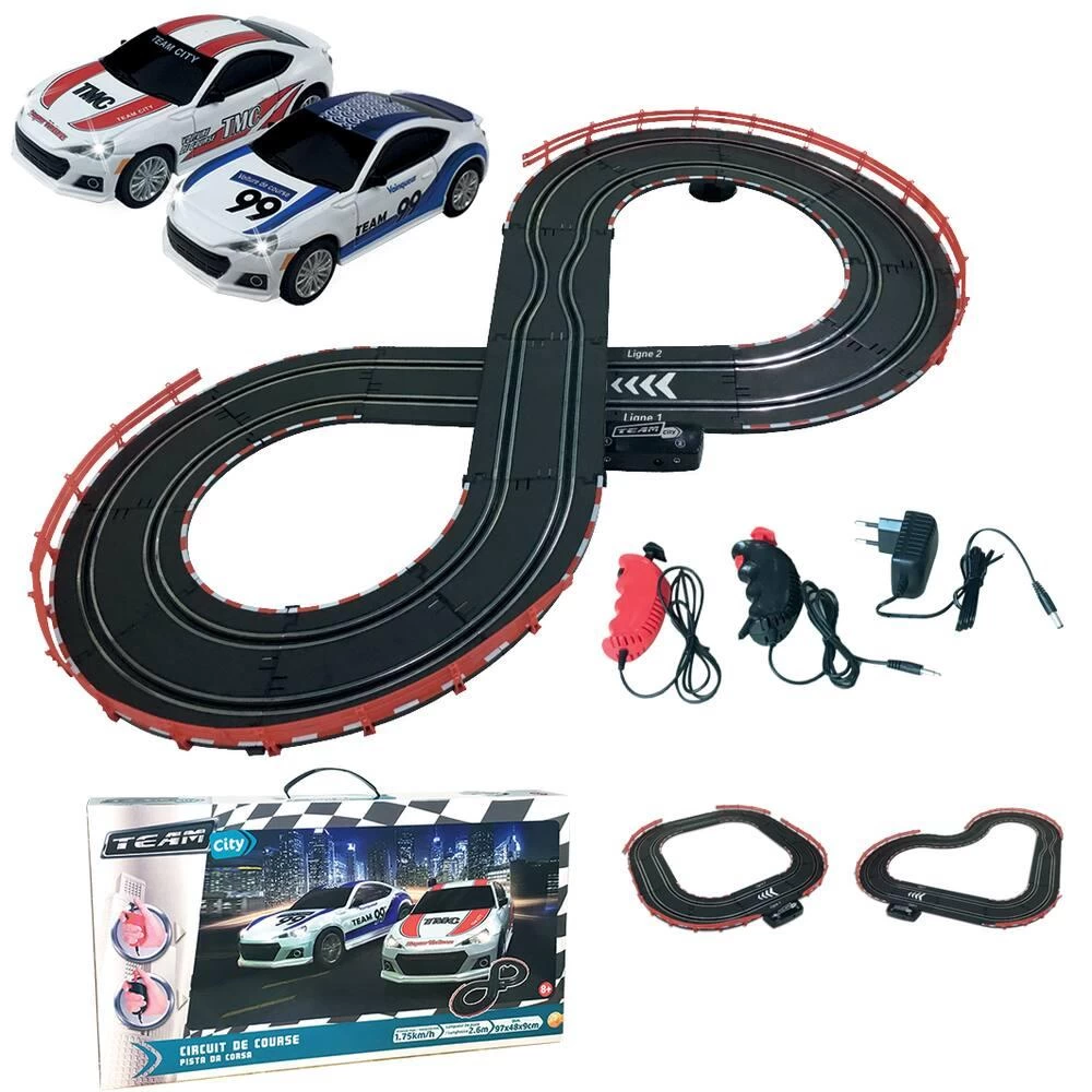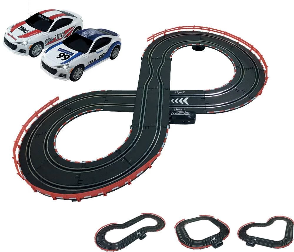 Longueur de piste : 2.6 mètres. Avec 2 voitures lumineuses incluses. Piste à deux rainures. 2 manettes simple d’utilisation avec bouton turbo pour plus de vitesse. Vitesse maximale : 1.75 km/h. Avec des rails, des glissières de sécurité et 1 adaptateur inclus. Quatre différentes façons d’assembler ton circuit possibles. Notice incluse avec les modèles de circuit. Exemple de circuit monté : 97 x 48 x 9 cm.