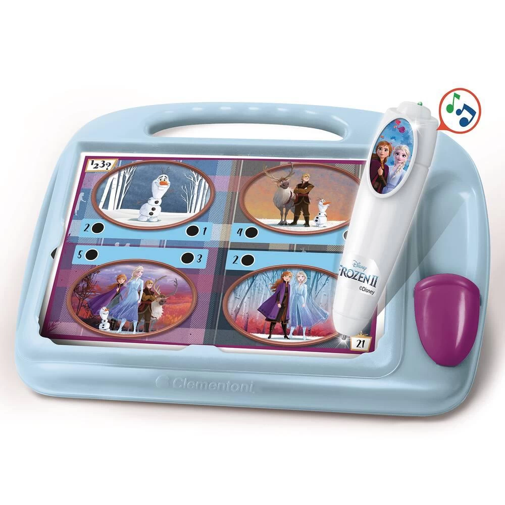 Un jeu éducatif de 18 activités avec la Reine des Neiges 2. Le pupitre éducatif est un jeu interactif pour découvrir les formes, les couleurs, les chiffres, les ensembles, l’espace et les dimensions à travers de nombreux quiz. L’enfant répond aux quiz sur les fiches en positionnant le stylo électronique sur les réponses. Le stylo indique si les réponses sont justes ou erronées par des effets sonores et lumineux. Le jeu permet à l’enfant de développer son sens de l’observation, sa mémoire et ses capacités d’association logique.