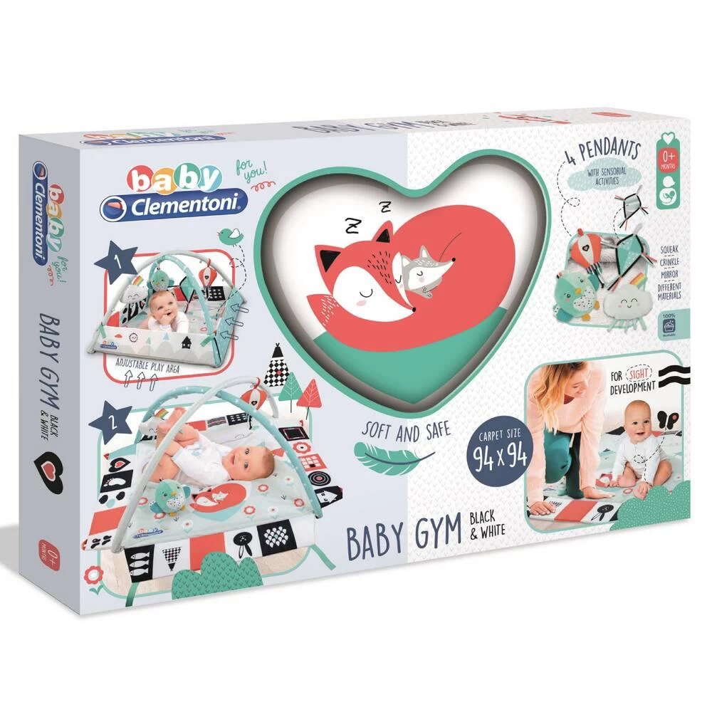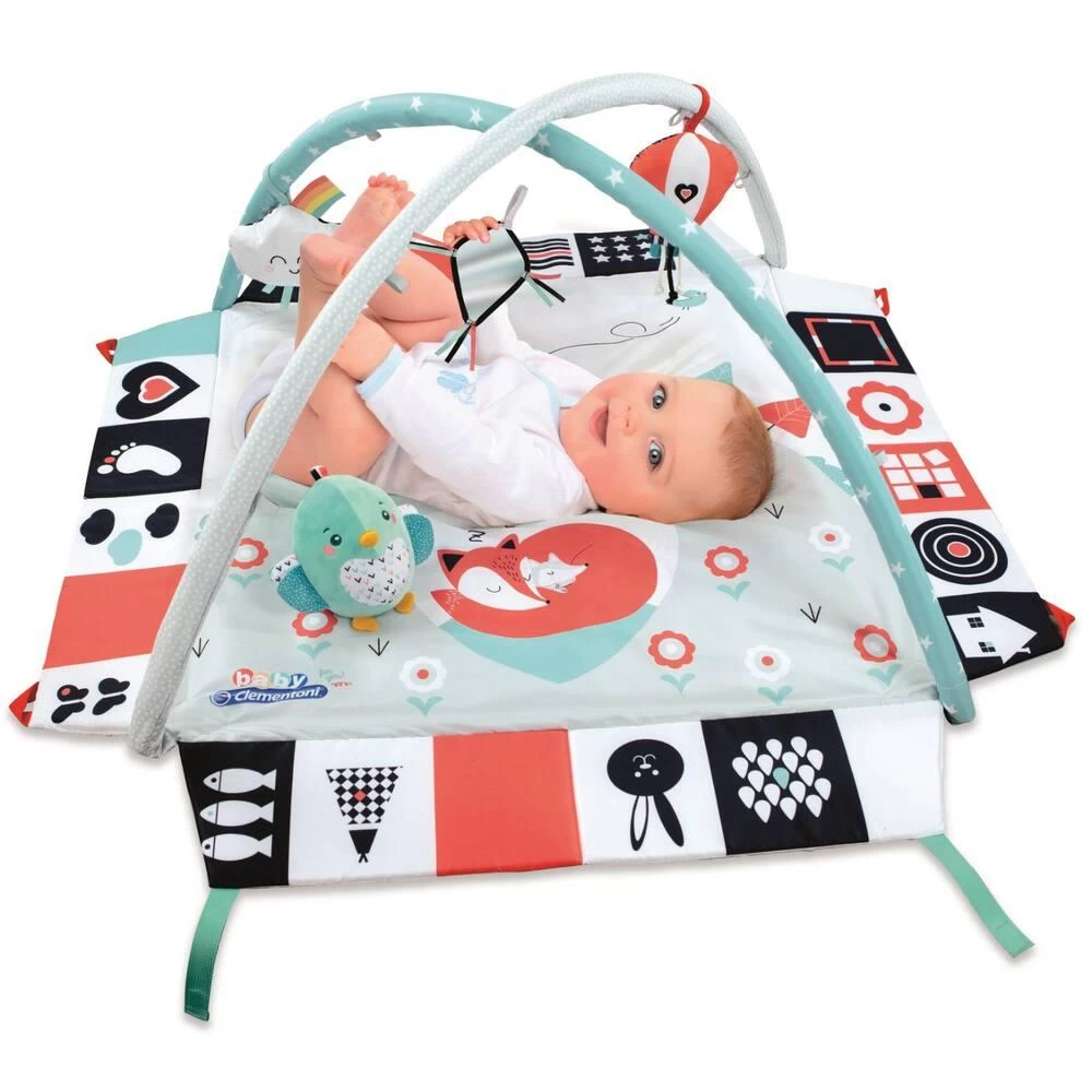 Ce tapis tout doux a été conçu avec des contrastes de noir et de blanc afin de stimuler le développement visuel de l’enfant durant ses premiers mois. Il contient 4 accessoires à suspendre, conçus pour favoriser l’exploration des sens : des rubans, des objets qui font du bruit et un hochet qui stimulent l’ouïe et le toucher et amusent l’enfant en captant son attention. Les bords du tapis peuvent être relevés pour permettre à l’enfant de jouer en toute sécurité. Les côtés sont décorés avec des images contrastées pour attirer le regard de Bébé.