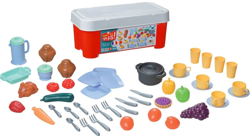 Un coffre de rangement pour la dinette rempli de viennoiseries, de fruits, de légumes, une cocotte, un service à repas, un service à thé et de nombreux accessoires. Le coffre a deux poignées de transport sur les côtés sous le couvercle. Fabriqué en plastique alimentaire, peut être lavé à l’eau savonneuse et porté à la bouche sans danger. Fabrication française. Contenu détaillé : un coffre avec couvercle, 3 viennoiserie, 11 fruits et légumes, une cocotte avec couvercle, 1 plat, 1 poulet rôti, 4 assiettes (dim. 10 x 10 x 1 cm), 4 couteaux, 4 fourchettes, 4 verres, 4 tasses, 4 soucoupes, 4 petites cuillères, 1 sucrier avec couvercle et 1 cafetière avec couvercle. 50 pièces au total.