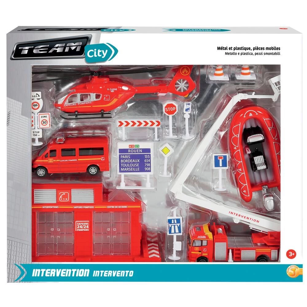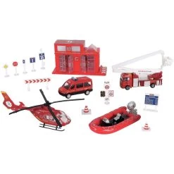 Set de jeu complet pour jouer aux pompiers. Coffret contenant : 1 caserne, 1 bateau (Longueur 13 cm), 1 camion d’intervention avec grande échelle, 1 véhicule de secours (fourgon), 1 hélicoptère et des panneaux de signalisation. Véhicules roues libres. La grande échelle se déplie (longueur maximale 32 cm) et tourne à 360°. En métal et plastique. Pièces mobiles. Dimensions de la caserne : 17,7 x 6,2 x 10 cm, du camion avec échelle pliée : 16 x 3 x 10 cm.