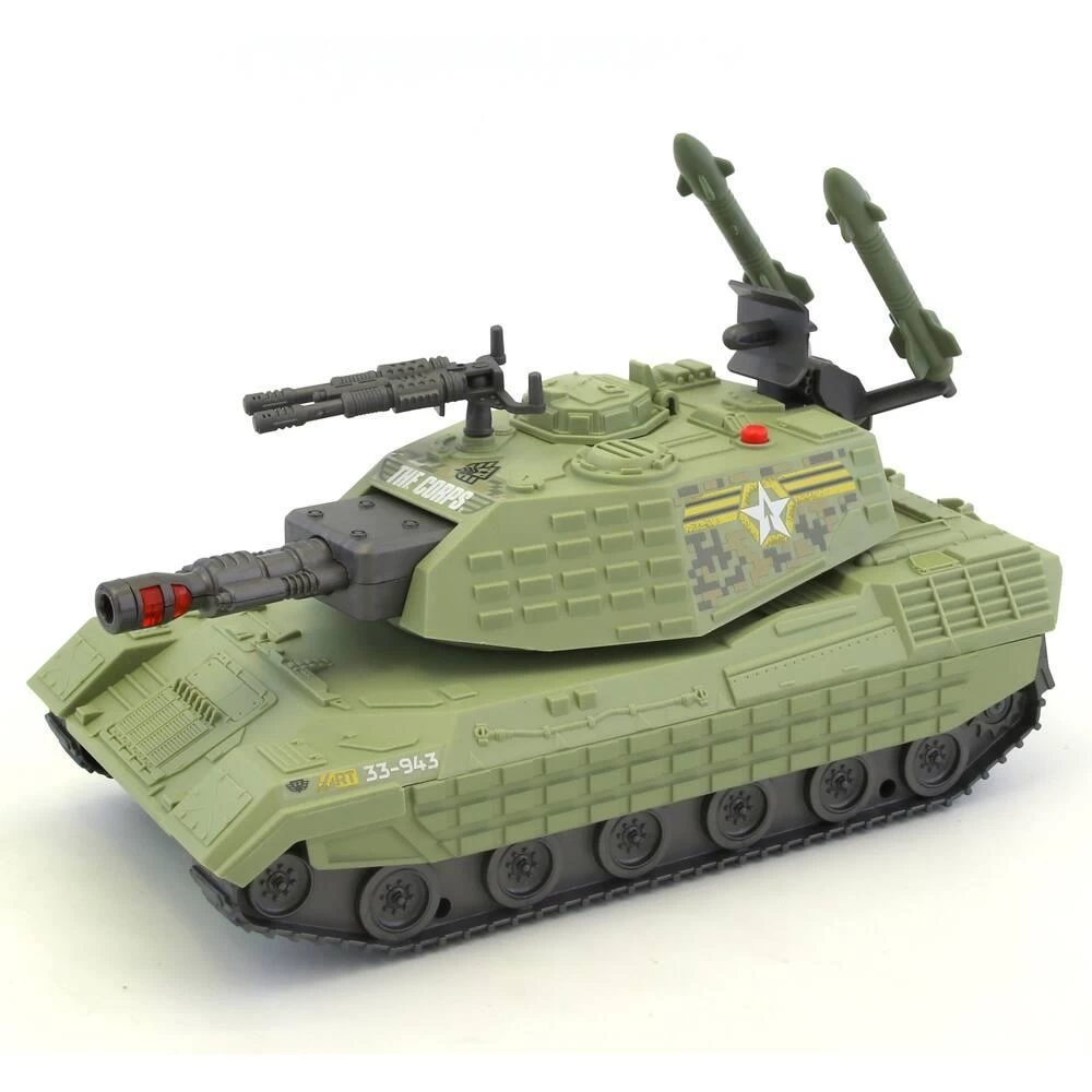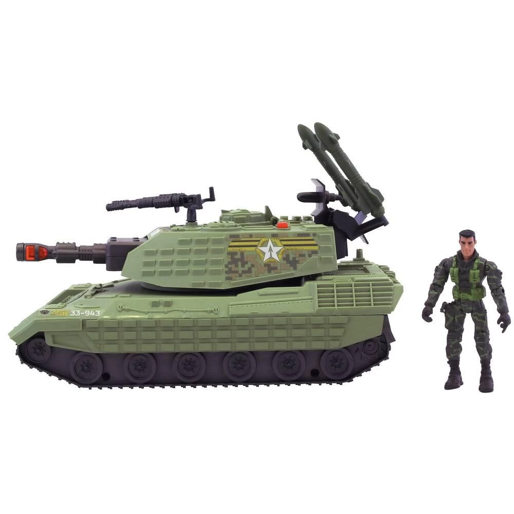Tank en plastique avec effets sonores et lumineux livré avec une figurine articulée de 10 cm et des accessoires dont des armes incluses. Véhicule roues libres. La tourelle du tank tourne manuellement. En plastique. Modèle et coloris selon disponibilité.