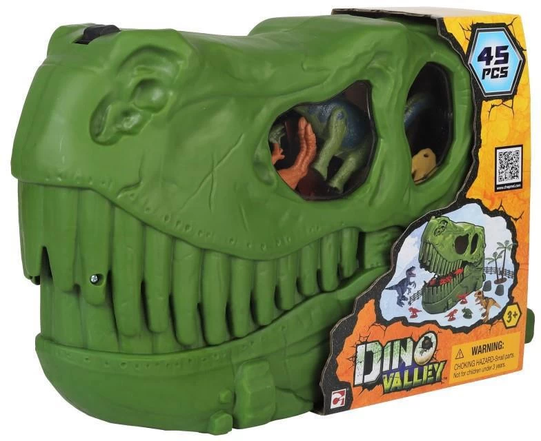 Boîte en forme de crâne de dinosaure 45 pièces avec figurines et silhouettes de dinosaures