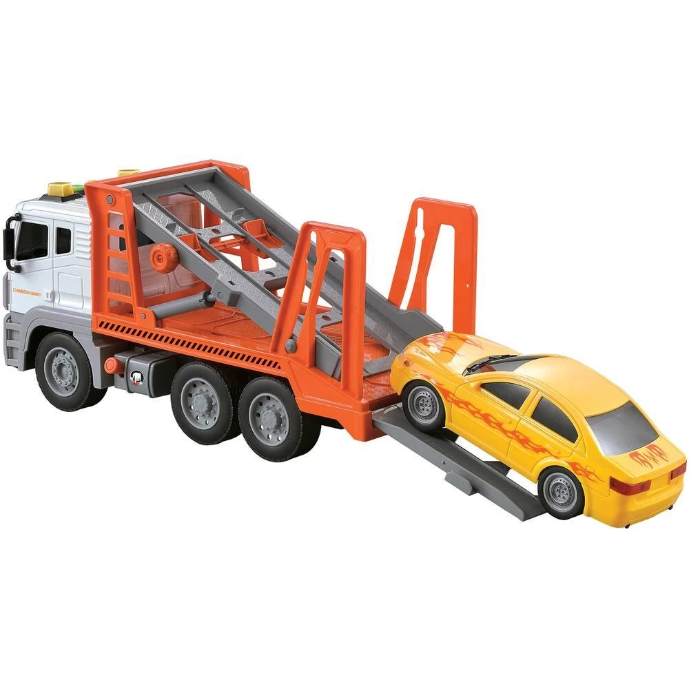 Echelle 1:12. Camion avec moteur à friction. Avec effets sonores et lumineux. Appuie sur les boutons sur le toit du véhicule pour déclencher des effets : par exemples le son du klaxon ou le bruit du moteur. Boutons pompe (système mécanique) pour faire monter et descendre la rampe pour la voiture. Avec mollette permettant de bloquer la voiture sur la rampe. Livré avec une voiture. En plastique.