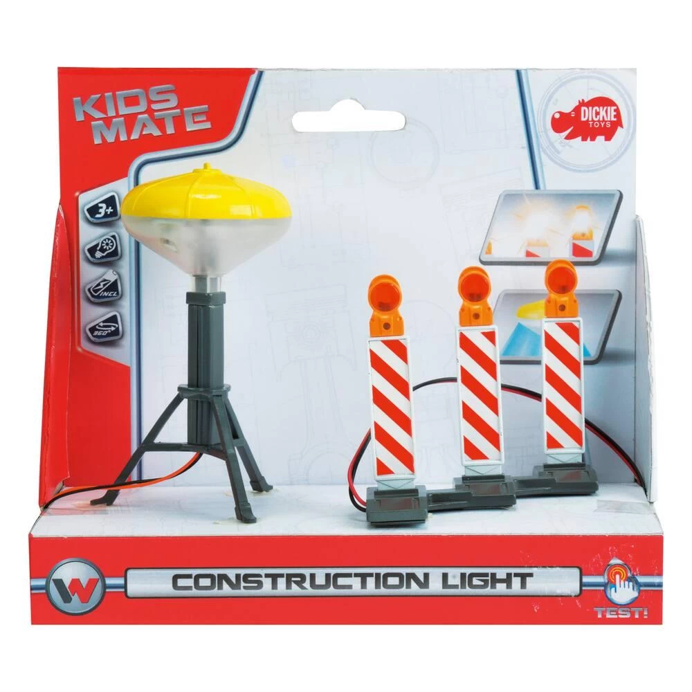 Un ballon d’éclairage avec trépied et des panneaux de signalisation lumineux.