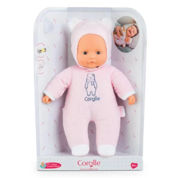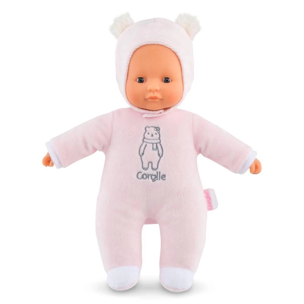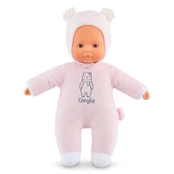 Pti’cœur Ours Rose est le cadeau idéal pour le premier anniversaire et/ou le premier noël ! Ce petit poupon de 30 cm a la taille parfaitement adaptée aux petits bras et mains de l’enfant pour être attrapé et manipulé très facilement. Son corps souple sans billes est léger et facile à saisir. Sa tête et ses mains, à la délicate senteur de vanille, sont en vinyle doux au toucher. Sa toile de corps est douce pour l’éveil des sens. Elle est non amovible. Sa capuche est munie de deux petites oreilles d’ourson toutes mignonnes. Elle peut être retiré mais reste astucieusement attaché grâce à une petite languette située derrière la tête pour éviter de l’égarer. Pti’cœur Ours Rose possède une étiquette pour écrire le prénom de l’enfant, bien pratique en cas de perte ! Yeux fixes. Lavable à la main.