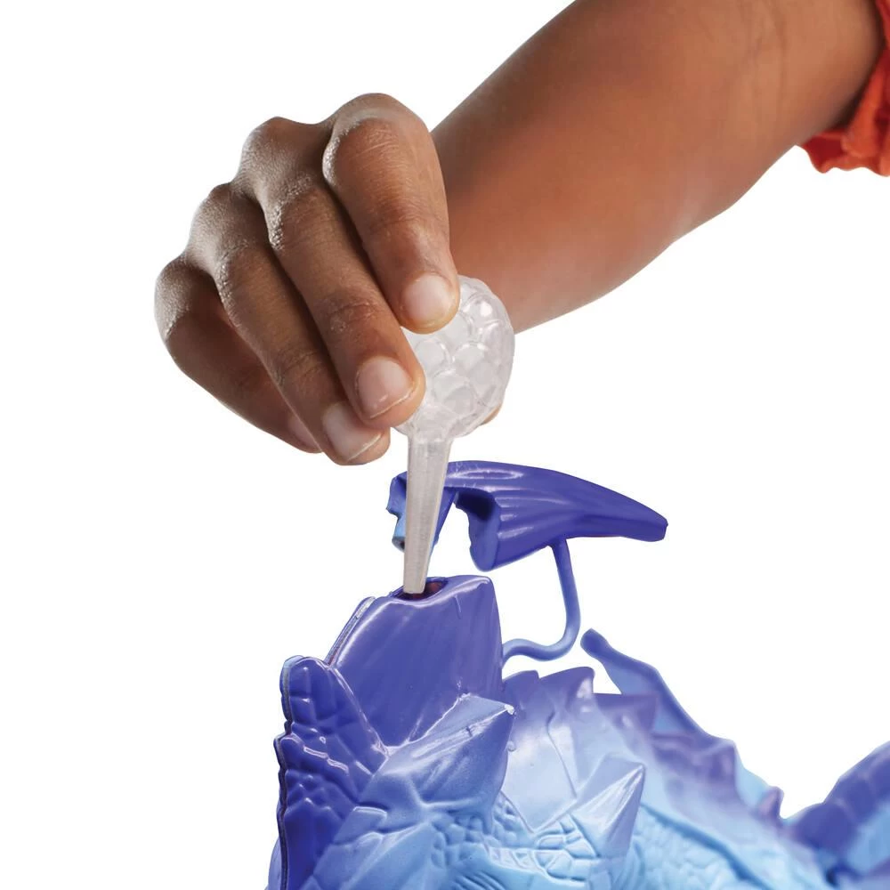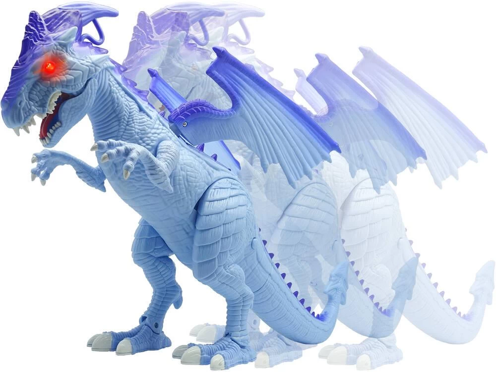 Dragon bleu qui marche réellement et au souffle ‘glacé’. Avec effets sonores et lumineux. Ajoute simplement de l’eau pour produire un souffle de glace ! Utilise la pipette fournie pour ajouter un peu d’eau dans la tête du dragon et voir ensuite l’effet souffle de glace ! Le dragon rugit et ses yeux s’allument ! Active le dragon et observe-le marcher et souffler de la glace ! Démarche féroce ! Bat des ailes ! 3 piles LR6 fournies. En plastique. Notice incluse.