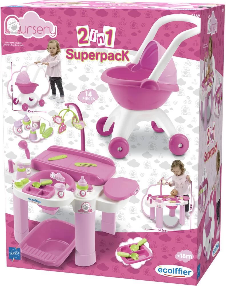 Avec coin repas, espace change avec mobile sous lequel se cache une baignoire, pèse-bébé et de nombreux accessoires. Un landau inclus (pour poupon de 32 cm).