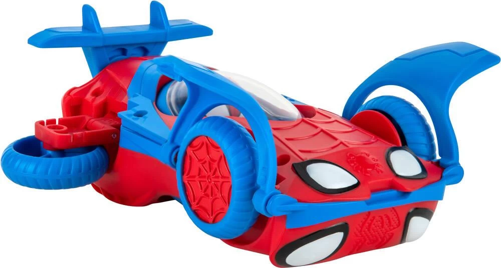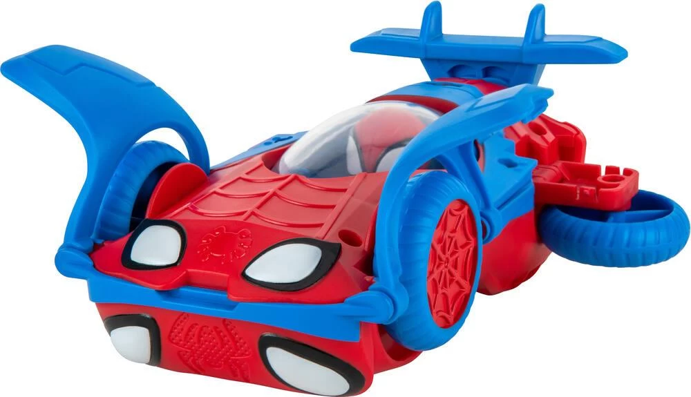 Marvel : Spidey and his Amazing Friends. Véhicule 2 en 1 de Spidey (Spider-Man) : la voiture se transforme en avion jet. Véhicule roues libres de 18 cm avec figurine Spidey intégrée. Figurine Spidey : non amovible (fixée au véhicule). Dimensions de la voiture : 18 x 9.2 x 7.5 cm. Instructions imprimées sur la boîte. Matière : en plastique. Licence : Disney.