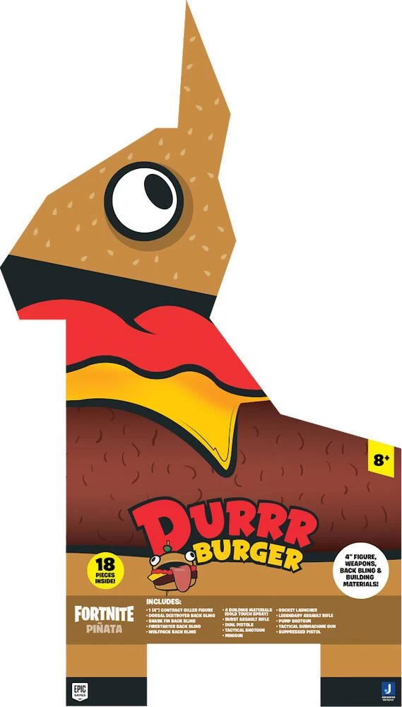 Contient : 1 Lama Piñata à casser (hauteur : 33 cm), 1 figurine de 10 cm articulée du skin Contract Giller, 4 sac à dos (Back Bling), 1 autocollant, des armes épiques de Back Bling et matériel de construction. En plastique. Licence : Fortnite.