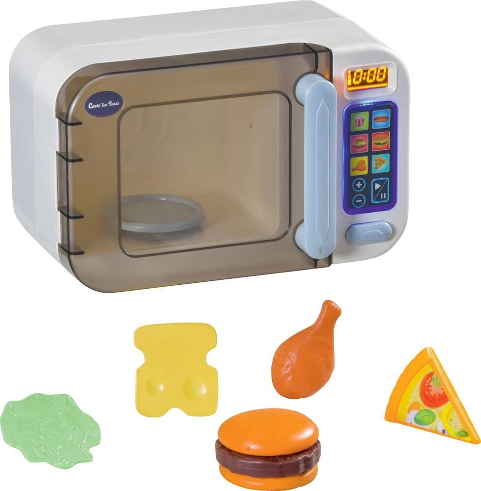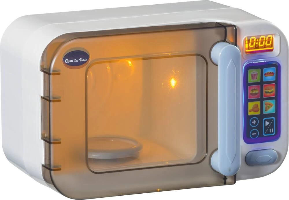 Four à micro-ondes avec lumière LED à l’intérieur. Livré avec 3 accessoires factices : un hamburger, une cuisse de poulet et une part de pizza. Avec effets sonores et lumineux. Boutons pour choisir 6 temps différents de cuisson. Boutons +/- pour augmenter ou diminuer le temps de cuisson de 30 secondes. Bouton marche/pause . Arrêt automatique après 20 secondes d’inactivité. En plastique.