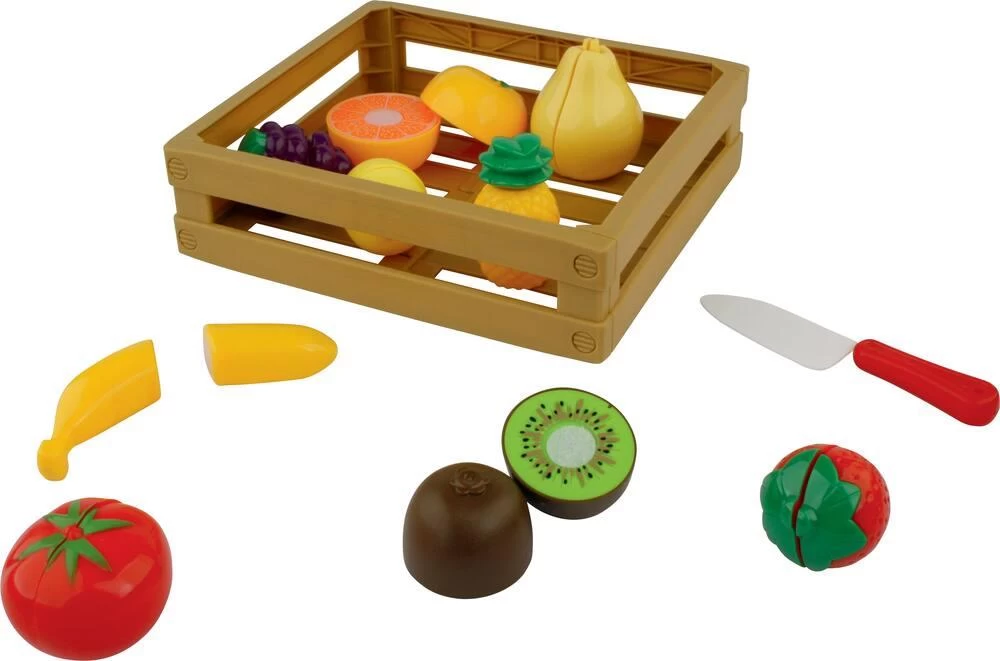 Coffret complet. Utilise le petit couteau pour trancher les fruits et les partage-les avec ta famille et tes amis ! Contient : une cagette, un couteau (15 cm) et 9 fruits à découper (système velcro). Dimensions de la cagette : 23 x 20 x 6 cm. En plastique. Jeu amusant qui permet à l’enfant de développer son imagination et de reconnaître les fruits.
