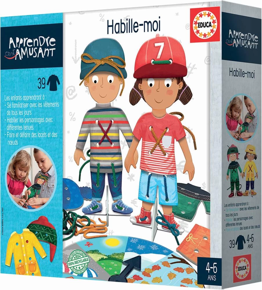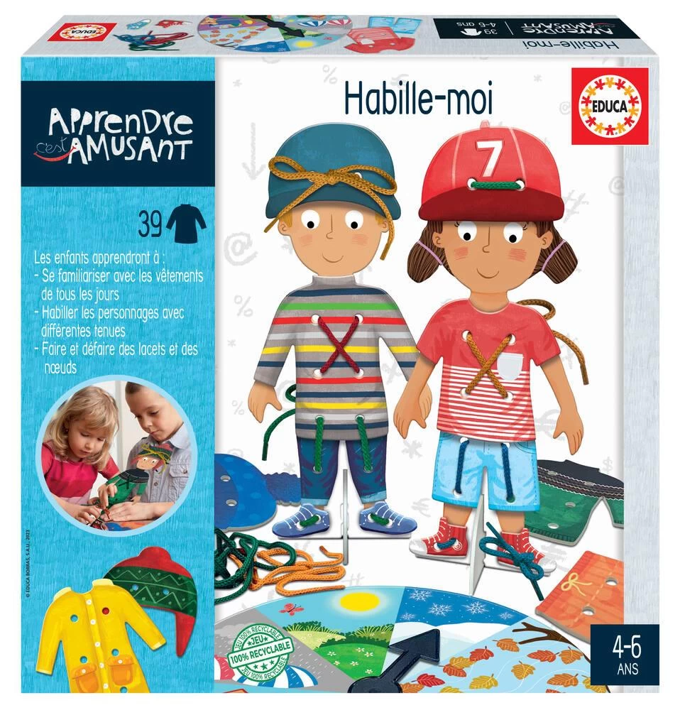 Apprends à t’habiller en mettant les vêtements que la roue a choisi aux personnages. 2 personnages, vêtements, 4 lacets pour attacher les vêtements et 1 roulette fournis.