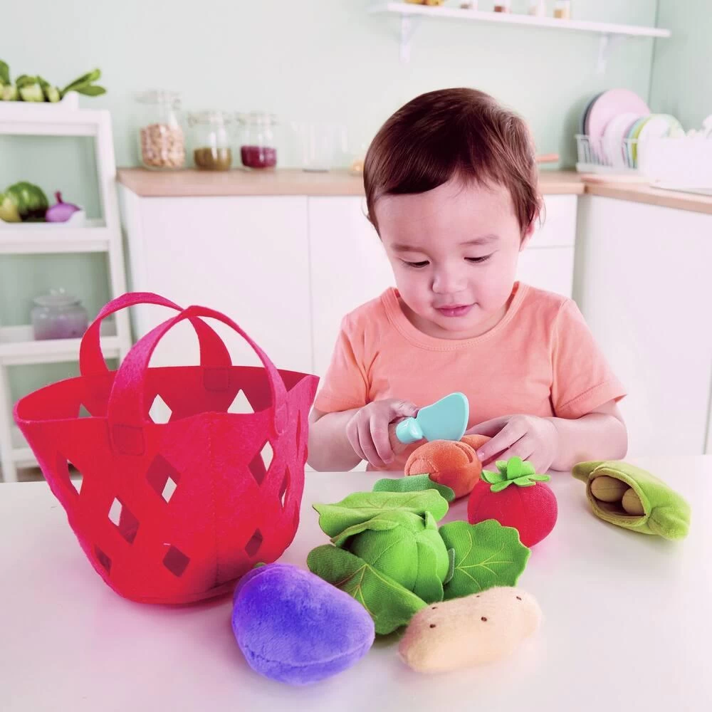 Remplissez ce doux panier en feutre avec six de vos légumes préférés. Contient 1 couteau et 6 légumes : 1 aubergine et 1 carotte à découper (système velcro), 1 petit pois à écosser, 1 salade à effeuiller, 1 pomme de terre et 1 tomate.