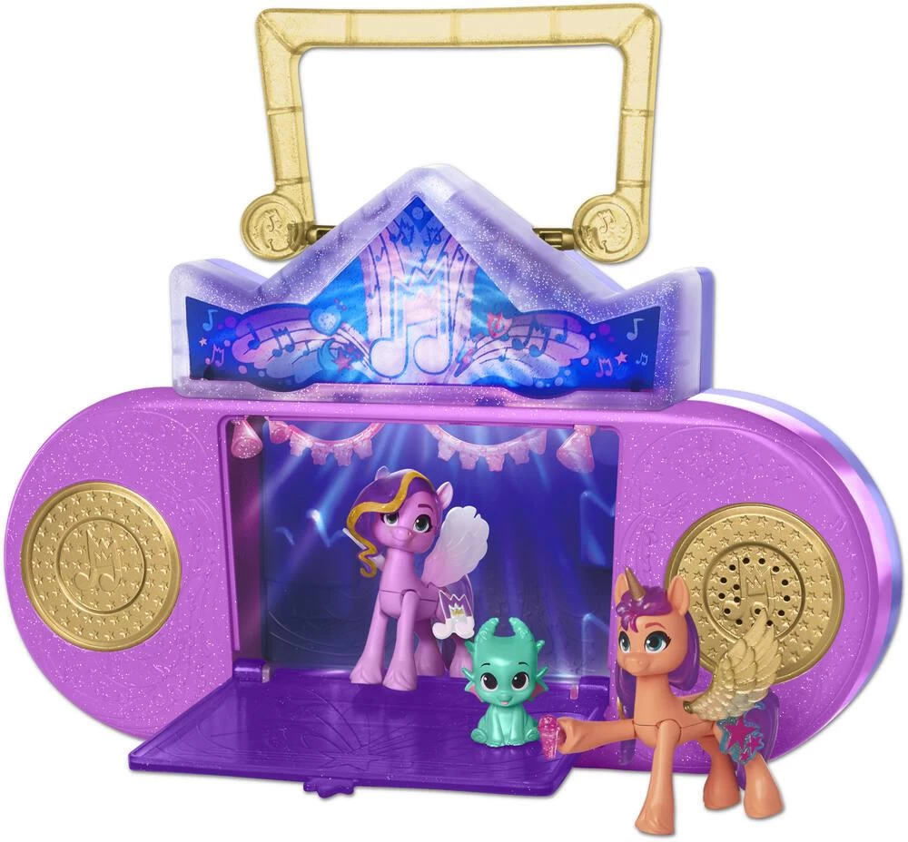 MARQUONS LES ESPRITS À MÉLODIA : Le tout premier salon/scène de karaoké de la Baie de Port-poney, inspiré de la série My Little Pony : Marquons les esprits Le coffret 2 en 1 Le spectacle musical inclut des sons et des lumières activés par les poneys. D’un côté du coffret on retrouve un salon avec un séchoir à crinière factice, une armoire pour ranger les accessoires et un miroir arc-en-ciel factice. En ouvrant l’autre côté du coffret on découvre une scène de karaoké avec sons et lumières. Pour activer la musique, il suffit d’appuyer sur le bouton de mise en marche ou d’insérer des poneys dans la scène. Chaque personnage activera des lumières et une musique uniques. Inclut les poneys de 7,5 cm Sunny Starscout et princesse Ruby Pétales, de même que la figurine de bébé dragon Sparky Sparkeroni. D’autres poneys Cutie Mark Magic et autres pouvant activer différentes musiques et lumières sont également disponibles (autres figurines vendues séparément, dans la limite des stocks). Inclut 16 accessoires, feuille d’autocollants et 2 charms en forme de marque de beauté.
