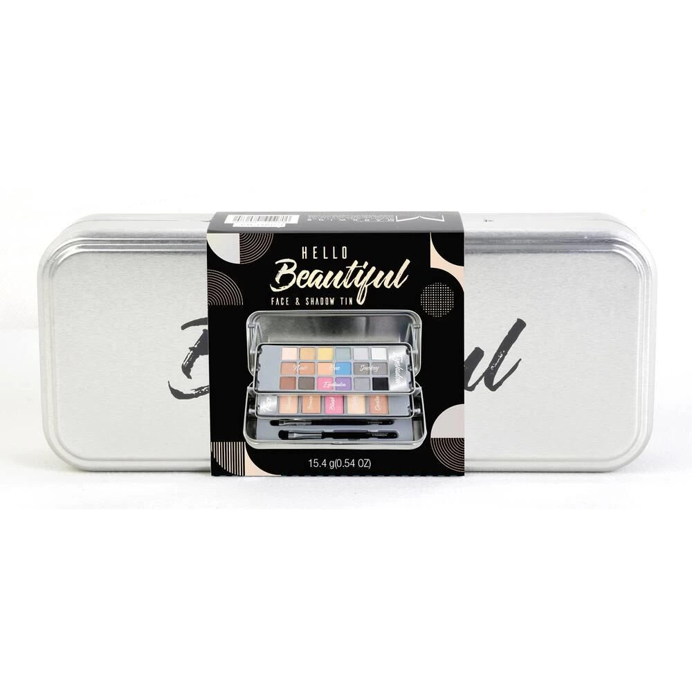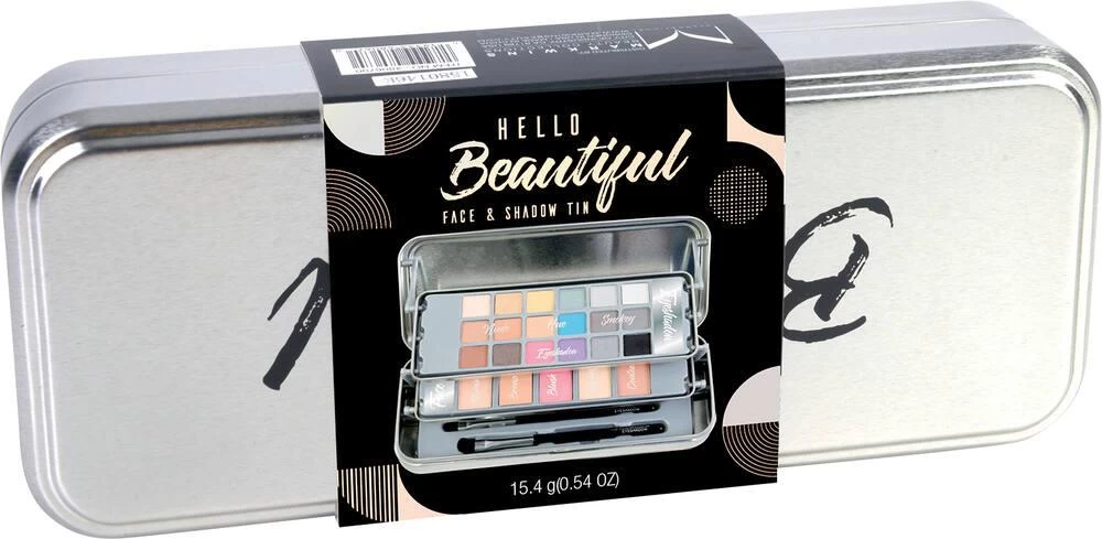 Hello Beautiful ! Vous allez adorer ce plumier en métal qui contient tout ce dont vous avez besoin pour mettre en valeur votre joli visage. Une collection de maquillage complète (18 ombres à paupières, 1 fard à joues, 1 contouring, 1 bronzer, 2 enlumineurs) qui inclut aussi des pinceaux (1 pinceau fards à paupières, 1 pinceau poudres teint).