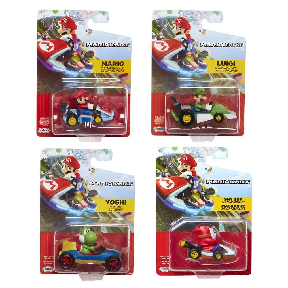 VĂ©hicule roues libres de l’univers Mario Kart. Modèle Mario ou Luigi ou Shy Guy ou Yoshi. La figurine du conducteur est fixe (non dĂ©tachable). En plastique. Collectionne-les tous ! Licence : Nintendo Mario Kart.