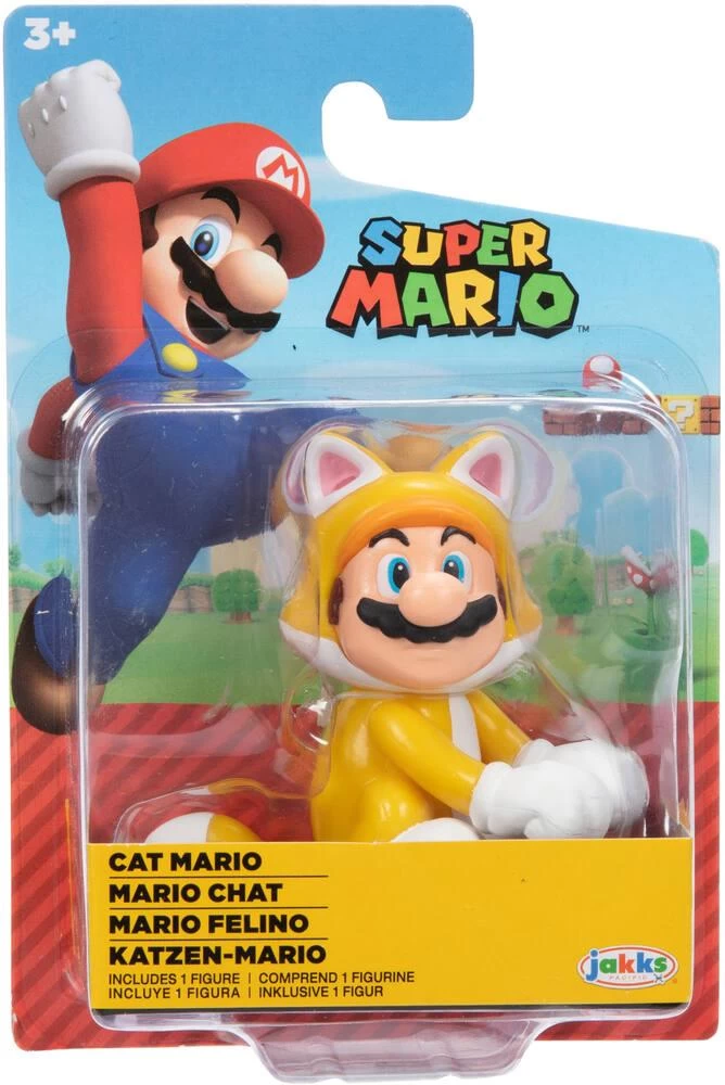 Mario se décline en figurine articulée de 6 cm (2.5 pouces). Vague 36. Plusieurs modèles assortis : Cat Mario, Boom Boom, White Running Yoshi, Spike, et Cheep Cheep. Retrouve les personnages de l’univers Nintendo dans cet assortiment. Les figurines peuvent être utilisées pour jouer avec nos différents coffrets (vendus séparément). Instructions imprimées sur la boîte.