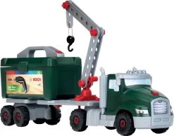 À l’aide de ta visseuse à effets sonores et lumineux, construis l’avant du camion, la remorque, la grue et le chariot élévateur avec palette ! La caisse à outils peut être fixée sur le camion.