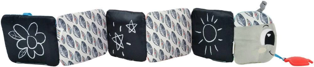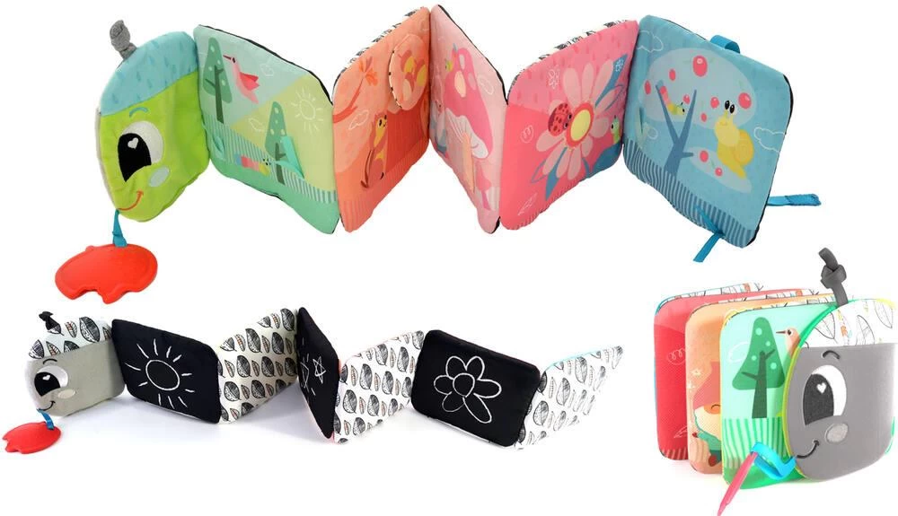 Un livre en accordéon, qui a également le style d’une mignonne petite chenille ! Chaque section de la chenille raconte une histoire colorée du voyage de la chenille dans les bois et de sa rencontre avec de nouveaux amis. Des éléments tels que des pouët pouët, des bruits de papier froissé et des textures sont intégrés dans les pages pour que bébé les découvre ! Le verso est conçu avec des pages contrastées en noir et blanc pour stimuler la vision des jeunes bébés. Un mignon petit anneau de dentition est également inclus pour que bébé puisse le mordiller et soulager ses gencives douloureuses. Une fois le livre terminé, il suffit de le plier et de le fixer à l’aide d’une fermeture velcro pour le ranger facilement et le transporter partout.