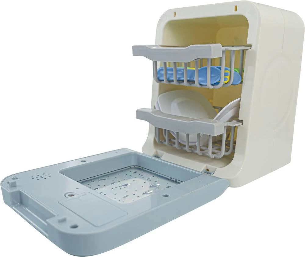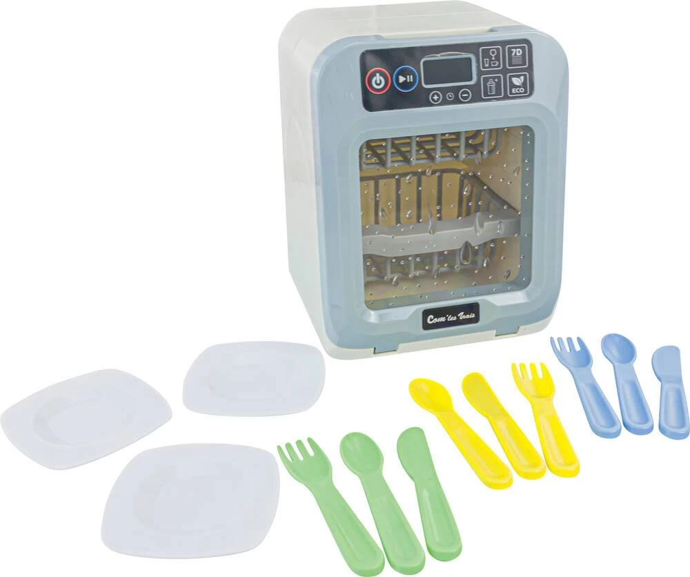 Lave-vaisselle avec accessoires. Effets sonores et lumineux. Boutons : 4 différents programmes de lavage, boutons pour ajuster le temps. La porte s’ouvre et les paniers sont amovibles pour récupérer la vaisselle. Inclus : 3 assiettes (dim. 9 x 9 x 0.7 cm), 3 fourchettes, 3 couteaux et 3 cuillères. 2 piles LR03 fournies. En plastique.