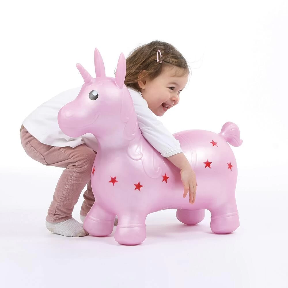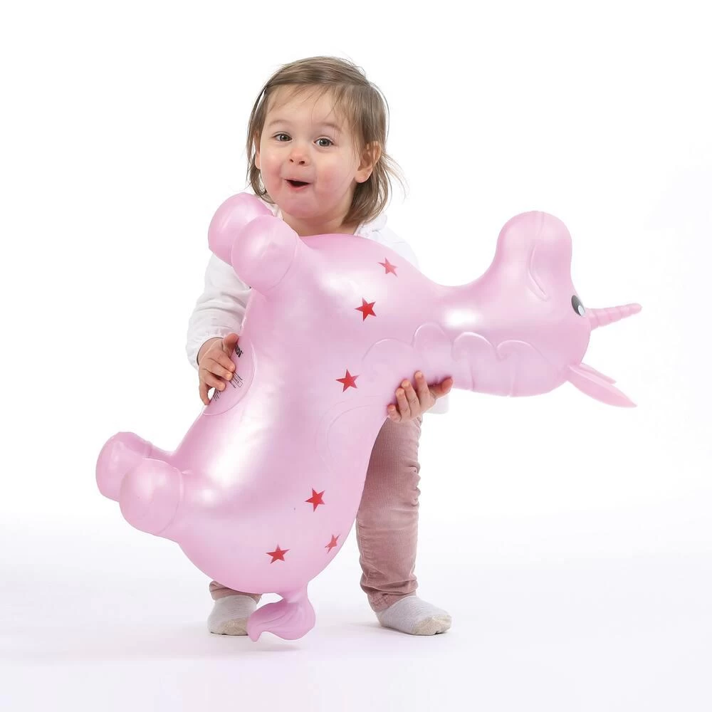 Jolie licorne sauteuse rose avec des étoiles, un cadeau idéal pour les enfants fans des licornes ! Adaptée pour les enfants à partir de 10 mois. Son caractère affectif et ludique en fait la grande copine des petits ! Parfaitement adaptée à la morphologie de l’enfant, il suffit aux petits de s’asseoir sur son dos et d’attraper sa corne ou ses oreilles pour se lancer, par petits bonds, à l’aventure dans la maison ou en plein air. Conçue avec des oreilles ergonomiques pour que les enfants puissent s’accrocher (prise en main parfaite à tout âge) et des pattes larges pour stabiliser les bonds. La licorne accompagne l’enfant à différents âges pour des jeux multiples : pour les tout-petits, elle est idéale pour le développement de la motricité. Pour les plus grands, bondir procure un bon entrainement aérobic, renforce les muscles abdominaux, encourage le contrôle de l’équilibre et le développement de la coordination motrice. 100% PVC, en plastique épais pour jouer librement en intérieur comme en extérieur. Comme un ballon classique, ce jouet sauteur est muni d’une valve pour le gonfler ou le dégonfler au gré des besoins : peu encombrante et très pratique pour l’emporter en week-end, vacances. Décorative, elle est aussi un élément de décor adorable dans la chambre de bébé !