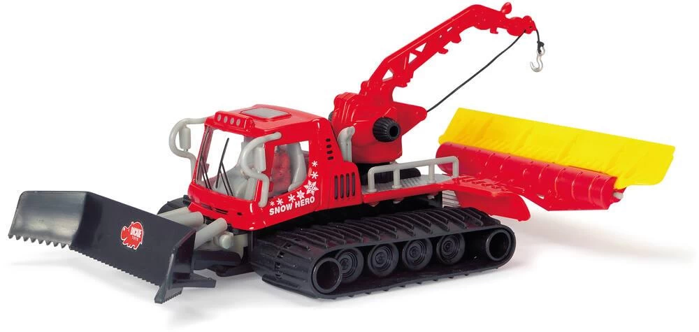 Dameuse 23 cm à roue libre avec pelle mobile, fraise et grue avec crochet. Plusieurs parties sont mobiles. La dameuse peut être utilisée aussi bien à l’intérieur qu’à l’extérieur.