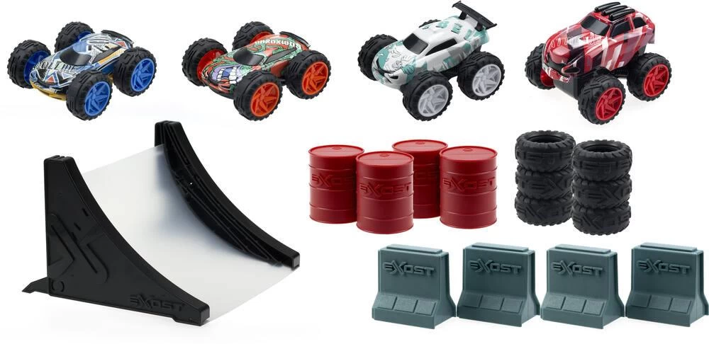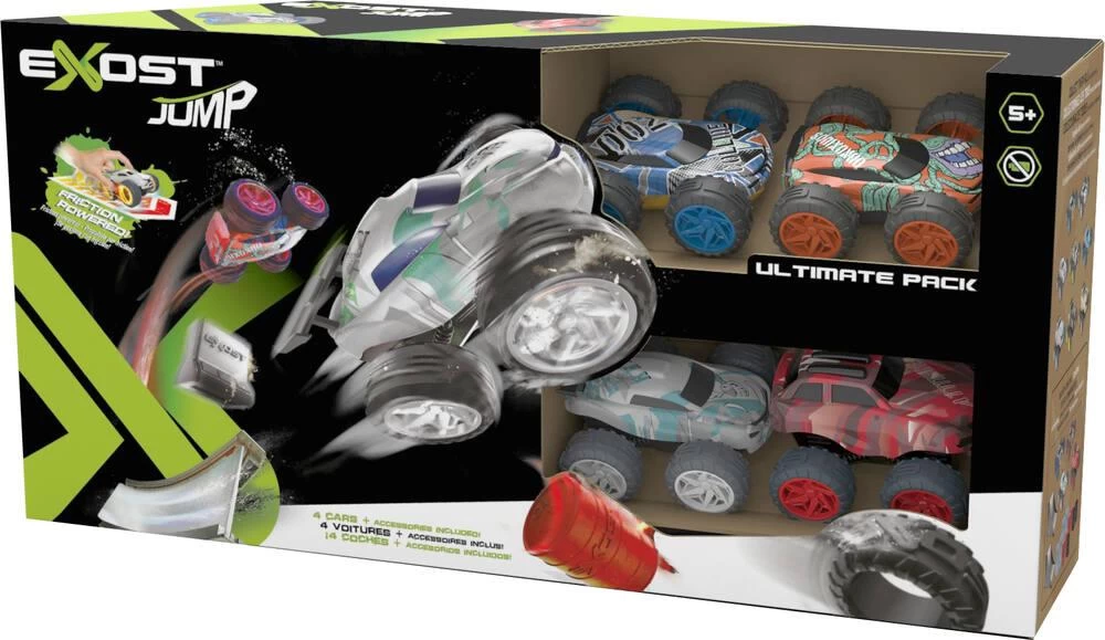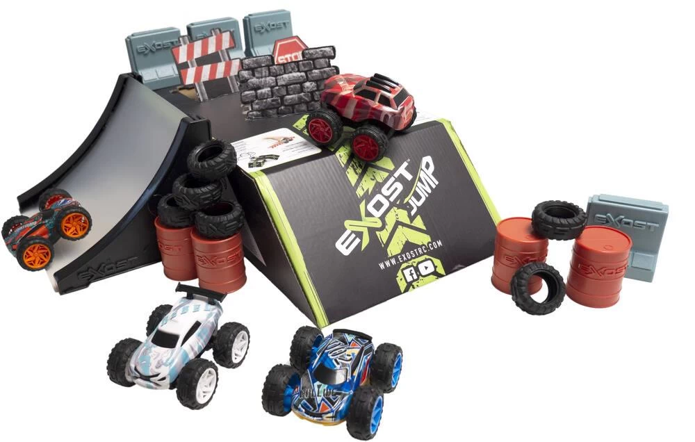 EXOST JUMP Maxi Circuit. 4 voitures friction 8 cm et accessoires. Construis ton circuit : 4 voitures pour un max de sensations. Circuit et rampes modulables : crĂ©er ton univers de jeu ! Retourne les boites : waouh tu peux Ă©galement t’en servir de rampe !