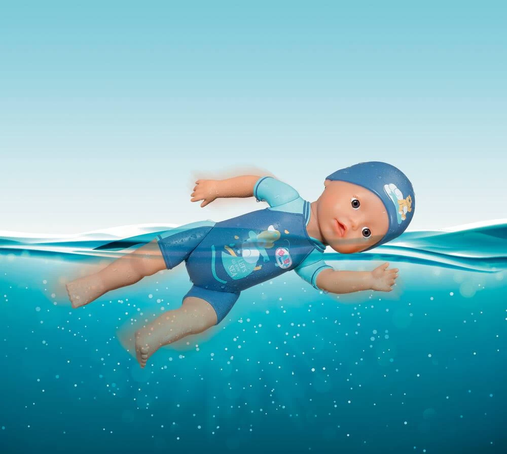 Baby born est un garçon sportif mais surtout un vrai petit dauphin. Pendant ses cours de nage il a déjà appris le crawl et le papillon. Au crawl il plonge un bras après l’autre dans l’eau. Au papillon aussi nommé la nage du dauphin il synchronise les deux bras. Et le tout sans pile. En tirant en arrière les bras du poupon à remonter vous la préparez pour sa prochaine longueur. Une fois les bras lâchés il nage dans l’eau. Les jambes et la tête du petit nageur sont mobiles. Ainsi il pourra s’asseoir au bord du bassin et regarder les plongeurs du tremplin pendant leur entraînement. Sa combinaison de nage bleue et son bonnet de bain sont imprimés en relief directement sur son corps et décorés de jolis motifs. La tenue rappelle les nageurs professionnels de compétition et les triathlètes. Taille poupon : 30 cm