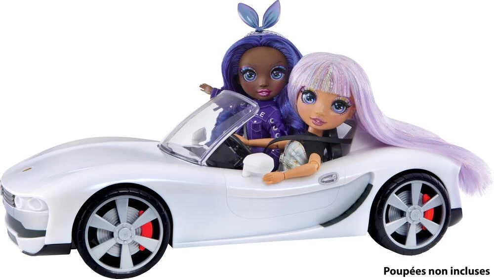 Ta voiture cabriolet Ă©quipĂ©e s’illumine aux couleurs de l’arc-en-ciel et change de couleur ! Contient 2 places et des accessoires. PoupĂ©es non incluses.