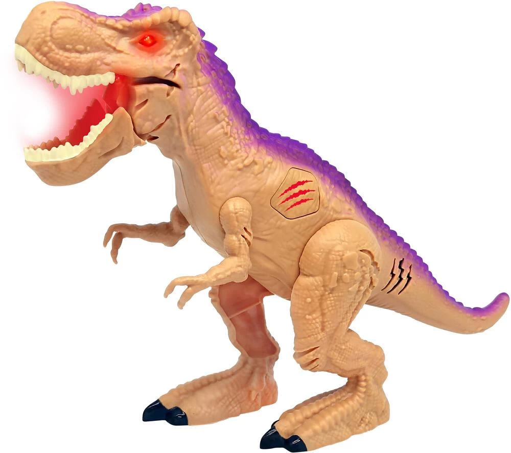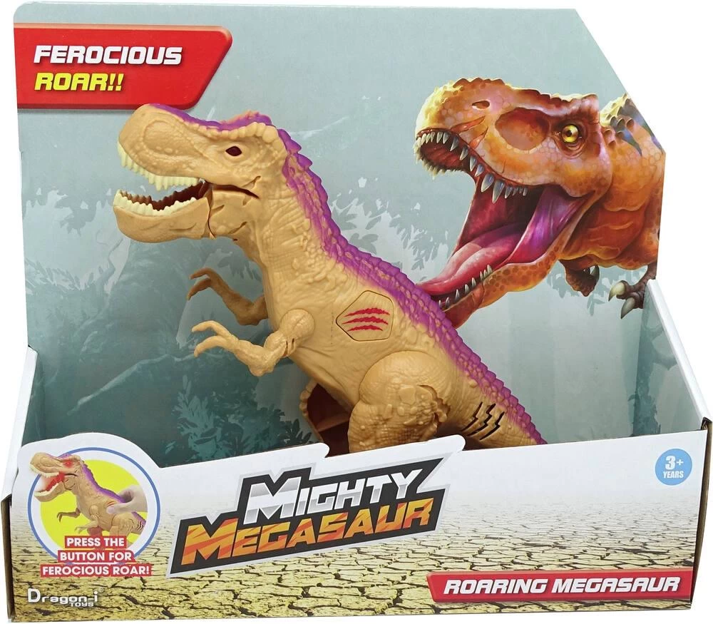 Mighty Megasaur. Dinosaure avec effets sonores et lumineux. Le T-Rex rugit, ses yeux et bouche s’allument ! Il suffit d’appuyer sur le bouton, côté gauche. Les bras et les jambes sont articulés. 2 piles LR03 fournies. En plastique. Instructions imprimées sur la boîte. Amusant et développe l’imagination.