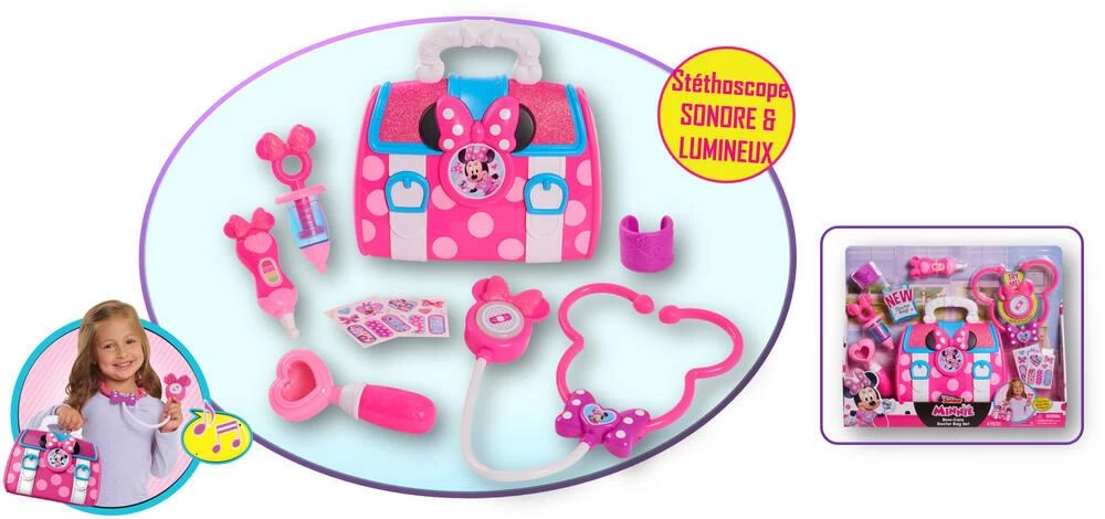 Minnie, Mallette de Docteur, 8 accessoires dont 1 stéthoscope avec fonctions sonores et lumineuses.