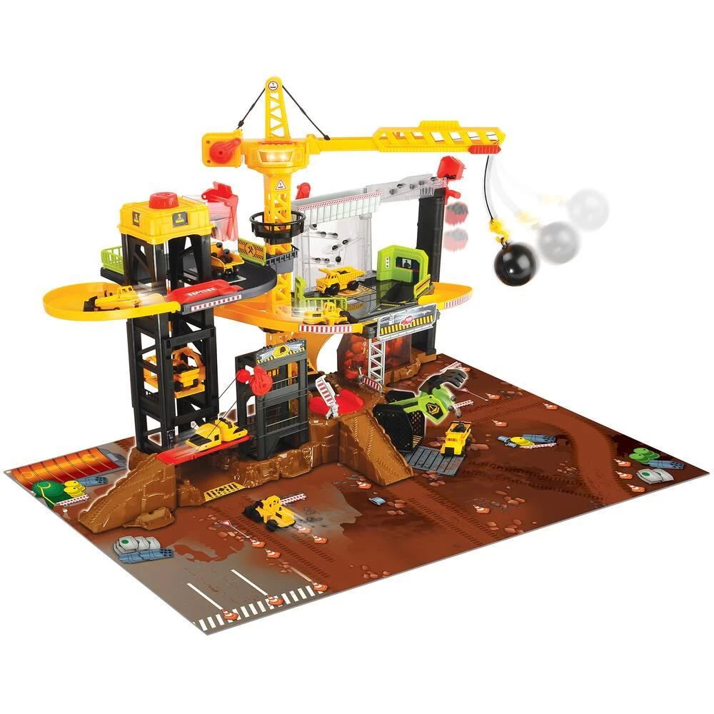 Coffret chantier de construction avec effets sonores et lumineux. Avec une grue mobile, un ascenseur pour engins de chantier, une plateforme tournante, 1 tapis roulant et des accessoires. Inclus 4 véhicules de chantier Die-cast : en métal et plastique, 7 cm. La grue tourne à 360 degrés et a des boutons au sommet pour déclencher des effets sonores et lumineux. Pièces mobiles. 3 piles boutons (LR44) fournies. Notice de montage incluse. Avec un tapis de sol imprimé en carton.