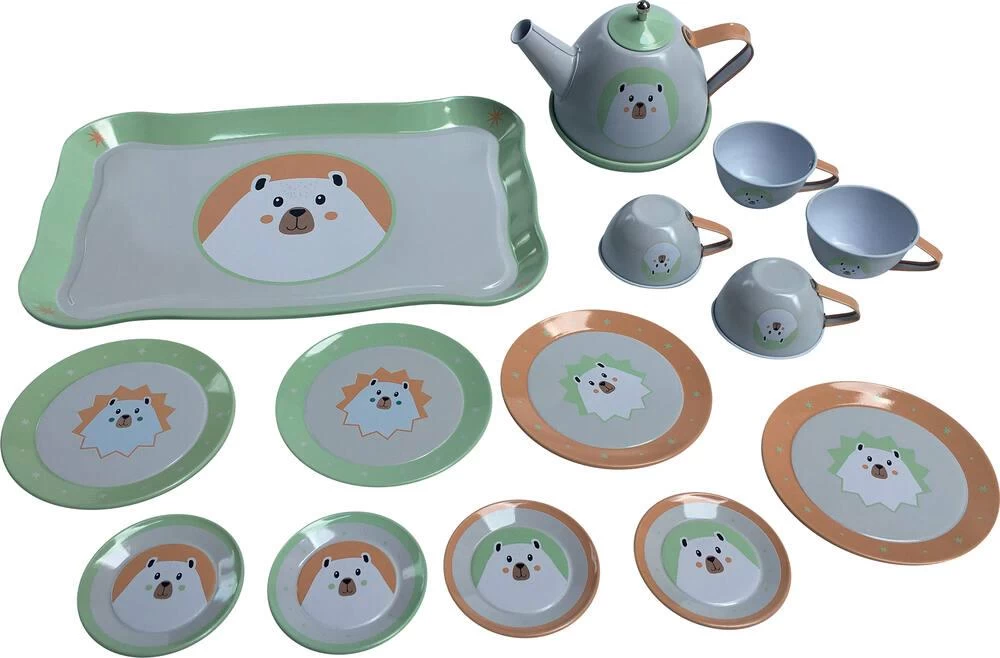 15 pièces. Avec 1 plateau (24 x 15.7 x 1 cm), 1 théière avec couvercle (12.8 x 9 x 8.8 cm), 4 assiettes (9 x 0.6 cm), 4 tasses (6.5 x 5 x 3 cm) et 4 sous-tasses (5.8 x 0.5 cm). En métal. Coffret complet.