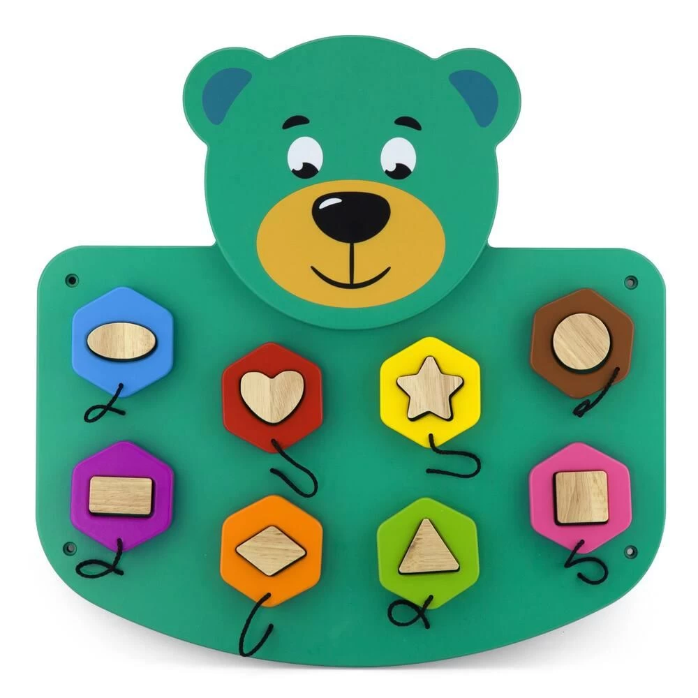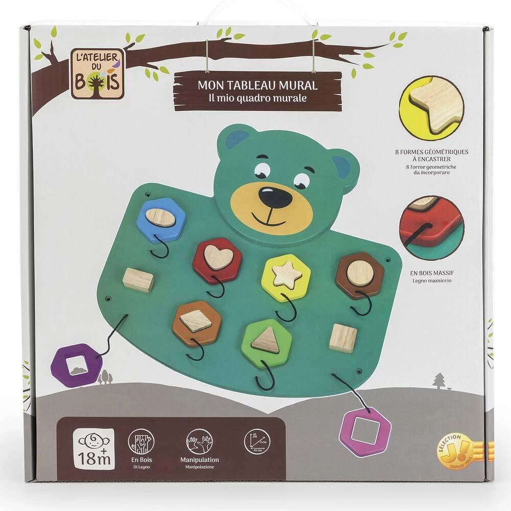 Ce joli tableau avec une tĂŞte d’ours permet aux enfants la reconnaissance des formes gĂ©omĂ©triques et des couleurs. L’enfant doit encastrer les 8 formes correspondantes, il peut aussi s’aider des couleurs. Les pièces Ă emboĂ®ter sont attachĂ©es au tableau (via une cordelette). PossibilitĂ© d’utilisation posĂ© au sol ou fixĂ© Ă un mur Ă hauteur de l’enfant. 4 vis fournies pour la fixation murale. Grosses pièces pour une bonne prĂ©hension. LivrĂ© assemblĂ©, la fixation au mur doit ĂŞtre effectuĂ©e par un adulte. Notice incluse. En bois massif. Poids du produit : 3 kg. SoliditĂ© et simplicitĂ© en font un bon jeu de dextĂ©ritĂ© pour les tout-petits. Design et couleurs attrayantes pour stimuler et distraire les enfants.