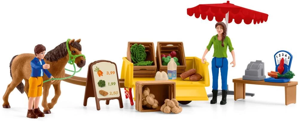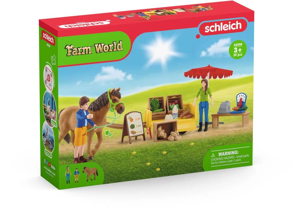 Ben FW et sa mère Laura chargent l’étal mobile de la ferme FARM WORLD de Schleich® de produits frais venant tout droit de leur ferme. La charrette transporte des pommes juteuses, des œufs fraîchement pondus, de la salade croquante, des pommes de terre cueillies dans le champ, du lait de vache refroidi et du pain croustillant. Une fois qu’ils ont tout chargé, ils attellent l’infatigable poney Poppy à la charrette et les voilà partis vendre leurs denrées. Ont-ils emporté suffisamment de pommes ? Les denrées se placent dans l’étal de la ferme suivant les besoins et l’aiguille de la balance se règle comme on le souhaite. Le lot offre une multitude de possibilités de jeu et s’intègre parfaitement à la ferme FW 42407.