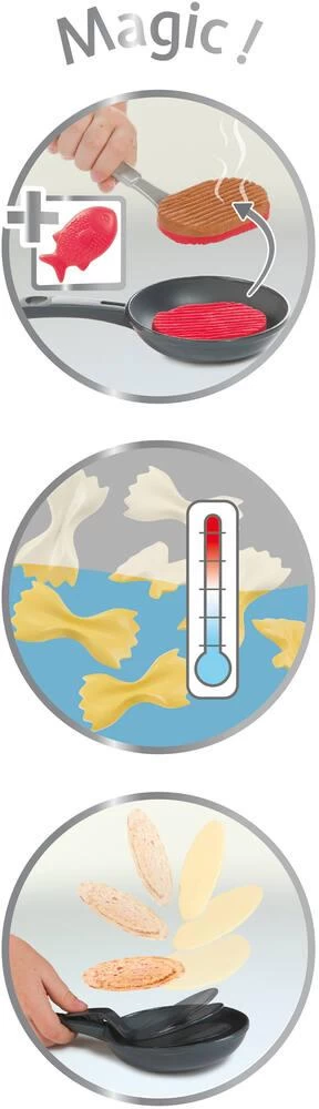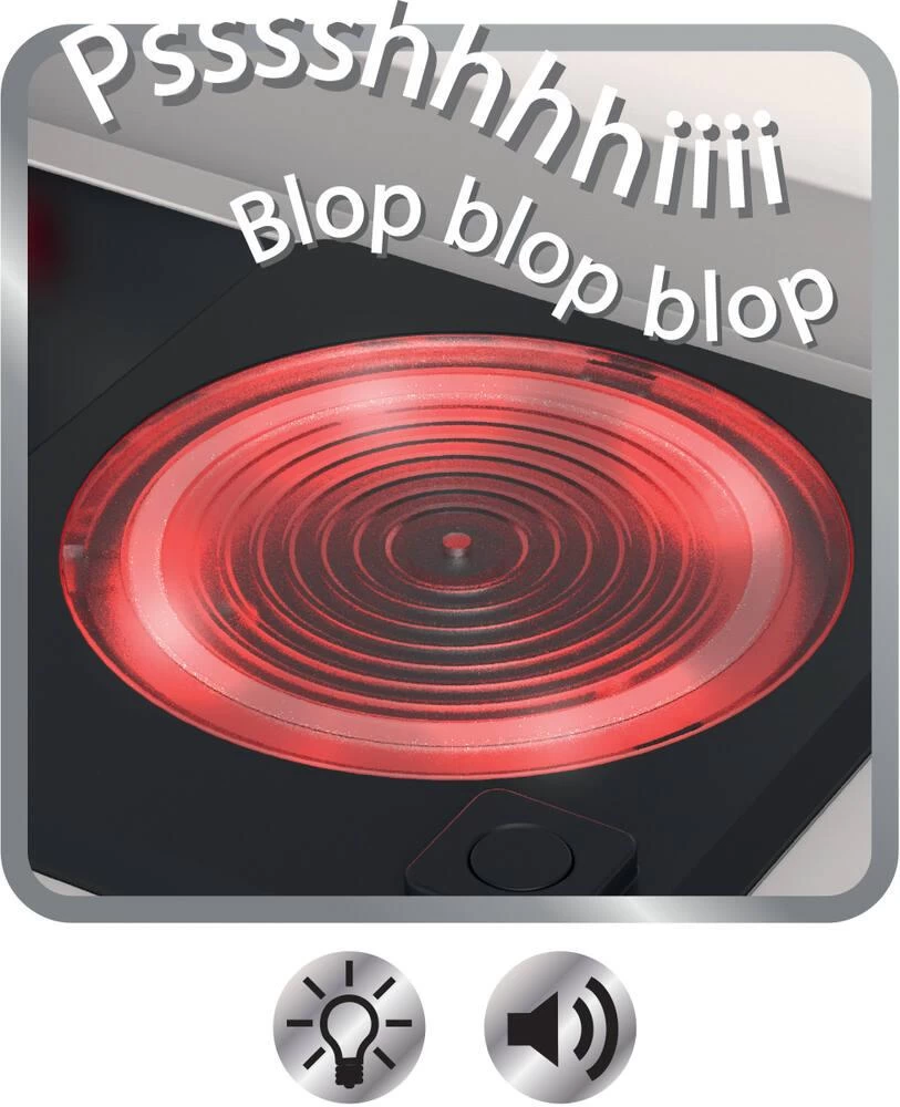 Cuisine avec une grande surface de jeu à 360° et de nombreuses fonctionnalités pour les enfants à partir de 3 ans. La cuisine Tech Edition est équipée de fonctions électroniques avec des effets sonores et lumineux : – La plaque de cuisson rougit et produit 2 sons de cuisson – la machine à café dispose d’un bouton permettant de déclencher des sons comme avec une véritable machine à café, et de la lumière. En appuyant une première fois, un voyant clignote pour indiquer la préchauffe, une fois que le voyant se fige il suffit de réappuyer pour faire couler le café. Une réserve d’eau avec un robinet permet de faire couler de l’eau pour de vrai