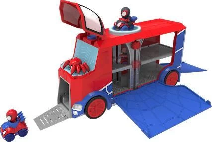 Marvel : Spidey and his Amazing Friends. Camion transporteur d’environ 35 cm avec effets sonores et lumineux. 2 mini véhicules de 5 cm inclus. Le transporteur peut contenir jusqu’à 8 mini véhicules. Il s’ouvre créant un décor de jeu avec un héliport. Le camion contient à l’avant un lanceur de mini véhicules. Fonctionne avec 3 piles LR6 incluses. Licence: Disney. Matière: en plastique.