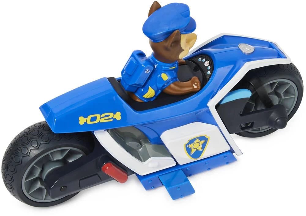 La moto radiocommandée de Chase officielle de La Pat’ Patrouille – Le Film pour se recréer les scènes du film et partir en mission à toute vitesse. Télécommande adaptée aux petites mains et simple d’utilisation : marche avant / marche arrière et multi-directions. Technologie 2,4 Ghz pour des performances maximales. Portée maximale : 20 mètres. Fonctionne avec 4 piles LR6 non fournies pour la moto et 2 piles LR03 non fournies pour la télécommande. Boîte ouverte. Notice incluse. Figurine Chase non amovible.