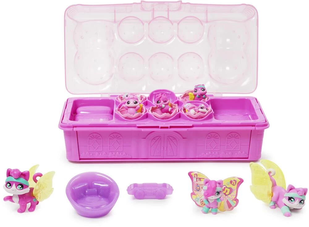 Boîte comprenant 10 figurines Hatchimals à collectionner dont 2 figurines Parent, 1 ado, 3 Enfants et 4 Bébés ainsi que 2 accessoires.